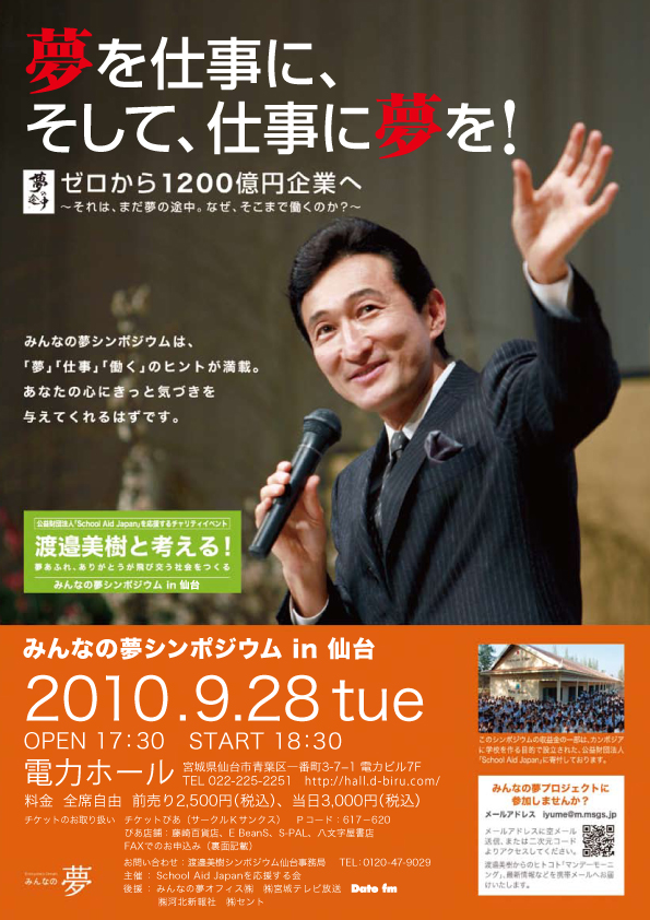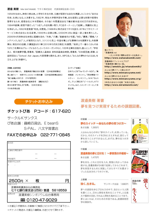 チケットは、最寄りの「チケットぴあ」か、渡邉美樹仙台シンポジウム事務局の